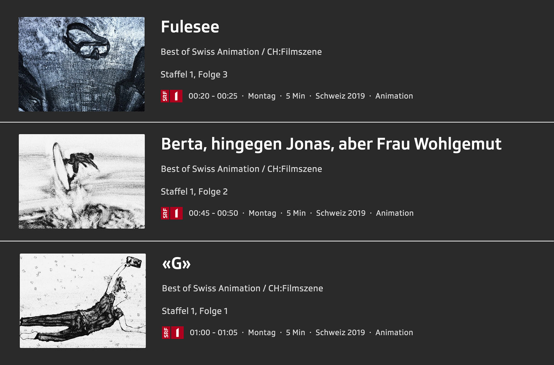 'Fulesee', 'Berta, however Jonas, but Mrs. Wohlgemut' and 'G' are part of the programme 'Best of Swiss Animation', late night on TV or anytime via replay on SRF Online: https://www.srf.ch/play/tv/